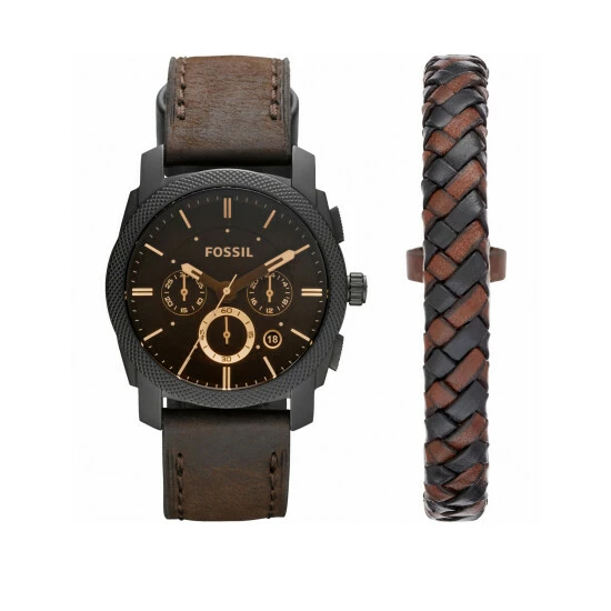 Fossil Machine Brown Leather Chronograph Watch Gift Set Men Dark Brown Mix
