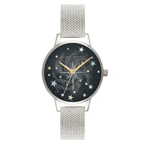 The Starburst Celestial watch from Olivia Burton makes a dramatic finishing touch for any outfit. A sleek silver-tone dial houses a striking black face, embellished with shooting stars, glittering stones and a sprinkle of glitter. Rose gold-tone hands give an on-trend mix of metals. The stainless-steel mesh bracelet is fastened with a clasp engraved with the brand’s signature bird silhouette.