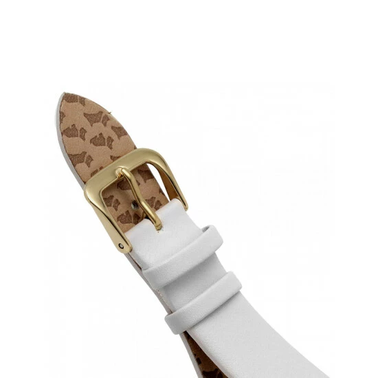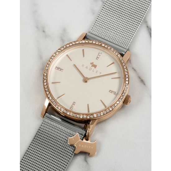 Complete your outfit in sleek style with this elegant watch from Radley. Its round face features slim hour markers for a minimalist look and is surrounded by gems for subtle sparkle. Signature Scottie dog branding features on the reverse of the adjustable leather strap and as a charm for a distinctive finish.