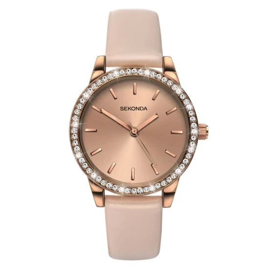 This Sekonda watch is a lesson in modern glamour. Its beige leather-look strap combines with a halo of white crystals set around the bezel for a dazzling effect. A polished rose gold-tone case further adds to its gleaming look. Slender hour markers and hands form its large watch face, bringing a pleasingly uncluttered look to the wrist. This timepiece fastens with a classic buckle.